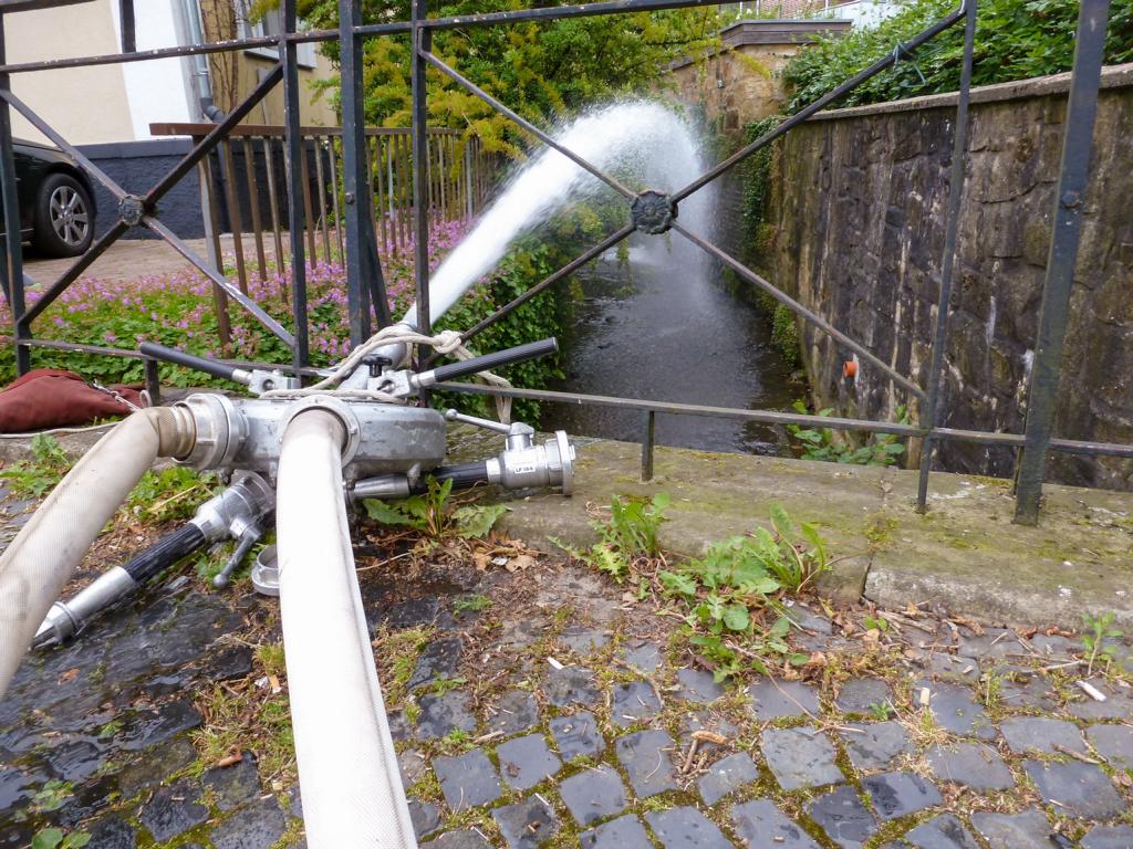 Bei Eintreffen der Einsatzkräfte betrug der Wasserstand teilweise 1,5 - 2 Meter. Mittels einer Feuerlöschpumpe wurde ein großer Teil der Wassermassen in den Glaner Bach gepumpt. Darüber hinaus wurden drei Tauchpumpen eingesetzt, um weitere Wassermassen über einen Gulli der Kanalisation zuzuführen.