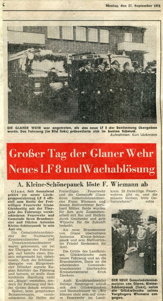 Die Gründung der Freiwilligen Feuerwehr Glane im Jahre 1934 hatte mit den damaligen politischen