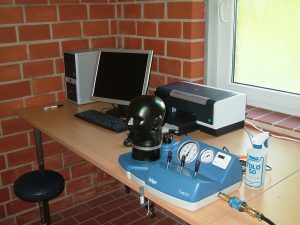 Laptop mit Gefahrstofferkennungsprogramm sowie Drucker und Faxgerät ausgestattet.
